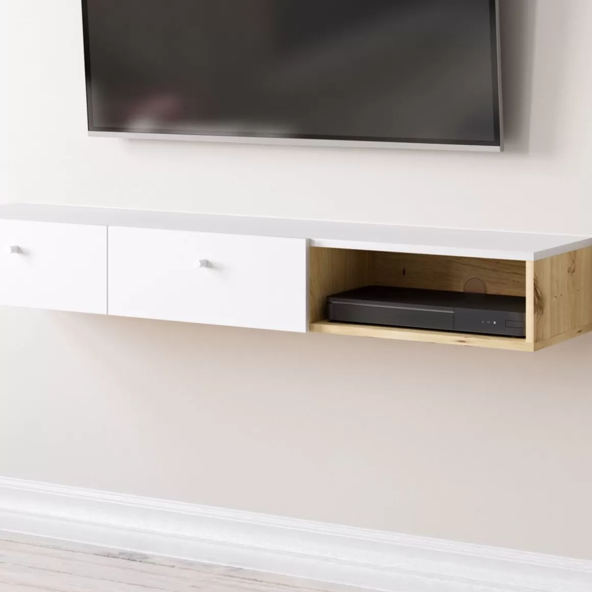 Szafka Prezentuje Się Wspaniale Dzięki Stylowemu Połączeniu Bieli Z Kolorem Naturalnego Drewna. W Półce Został Fabrycznie Wycięty Otwór Na Kable, Dzięki Czemu Łatwo Połączysz Niezbędny Osprzęt Z Telewizorem.Materiał