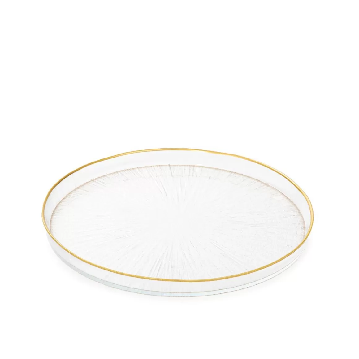 Opis ProduktuEleganckie Szkło DekoracyjneOtoczony Złotą ObwódkąWysoki BrzegŚrednica: 21 CmPłaski Talerz Z Przezro…